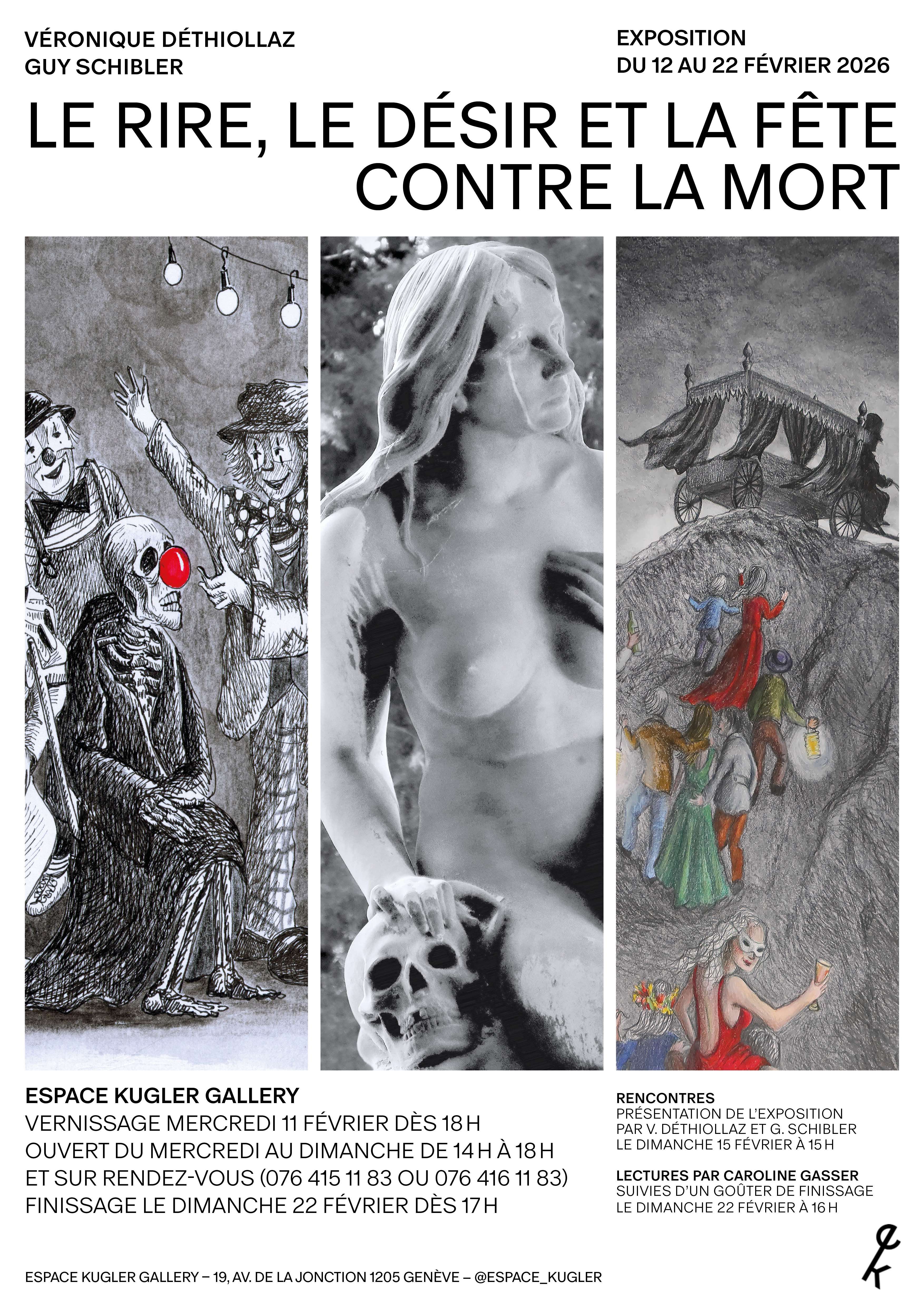Exposition du 12 au 22 février 2026 LE RIRE, LE DÉSIR ET LA FÊTE CONTRE LA MORT Véronique Déthiollaz (dessins) et Guy Schibler (photographies) Vernissage : mercredi 11 février dès 18 h et sur rendez-vous (076.415.11.83 ou 076.416.11.83) Présentation de l’exposition par V. Déthiollaz et G. Schibler : dimanche 15 février à 15 h Lectures par Caroline Gasser, suivies d’un goûter de finissage : dimanche 22 février à 16 h Face à la fatalité de sa fin, l’être humain n’a jamais cessé d’adopter des attitudes de défi et de provocation. Parmi celles-ci, le rire, l’érotisme et la fête occupent une place singulière. Le premier désamorce la violence de la mort en la tournant en ridicule ; le second exalte son contraire, la vie, en célébrant l’énergie et la puissance joyeuse du corps — fût-ce en le figeant en pierres de chair ; la troisième suspend les règles et les rythmes du quotidien et s’autorise des excès aux allures de bravade. L’exposition explore ainsi trois manières de résister à l’angoisse du trépas : des dessins ironiques qui jouent de la dérision - squelettes grotesques, faucheuses humiliées -, des photographies de cimetières où s’exprime la sensualité de sculptures funéraires d’une féminité souvent provocante, et des dessins encore, où la fête et ses couleurs nous font oublier pour un temps la finitude de notre condition. Dans les trois cas, une même nécessité se révèle : refuser la douleur, la disparition, l’oubli. Car rire, désirer, faire la fête sont, depuis toujours, des formes essentielles de l’affirmation de la vie. Diplômée de l’ESAV (actuelle HEAD) en 1985, Véronique Déthiollaz a enseigné les arts plastiques pendant 40 ans et se consacre désormais entièrement à sa pratique artistique. Elle dessine. Le plus souvent au crayon graphite et quelquefois au pastel, à l’encre. Elle raconte un monde qui la hante, réel, fantasmé, délité. [www.veroniquedethiollaz.ch] Guy Schibler a été cinéaste, puis professeur de philosophie et de cinéma, avant de se consacrer dès 2007 à la photographie (à sa pratique et à sa théorie). Ses intérêts vont tout naturellement vers les interfaces photographie-philosophie et photographie-cinéma. Sa production se décline en séries. [www.guyschibler.ch] |