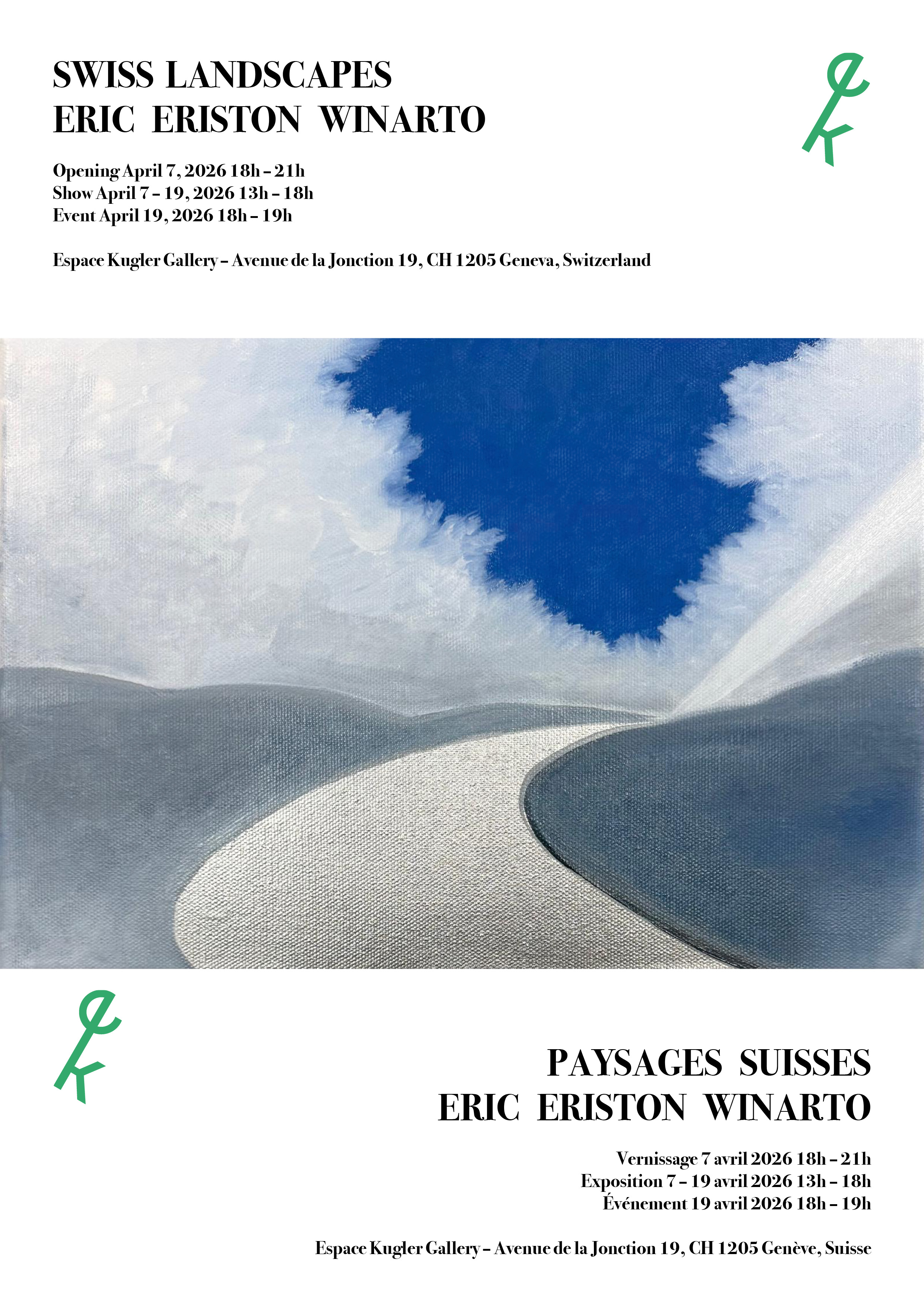 Plus qu’une peinture réaliste ou photographique, le travail d’Eric Eriston Winarto s’inscrit dans une recherche autour du mystère pictural. Présenté à Espace Kugler Gallery à Genève, cet ensemble de peintures — réalisées en grand nombre sur format A4 — puise son inspiration dans les paysages suisses observés lors de ses déplacements, ainsi que dans l’héritage de peintres tels que William Turner et Ferdinand Hodler.